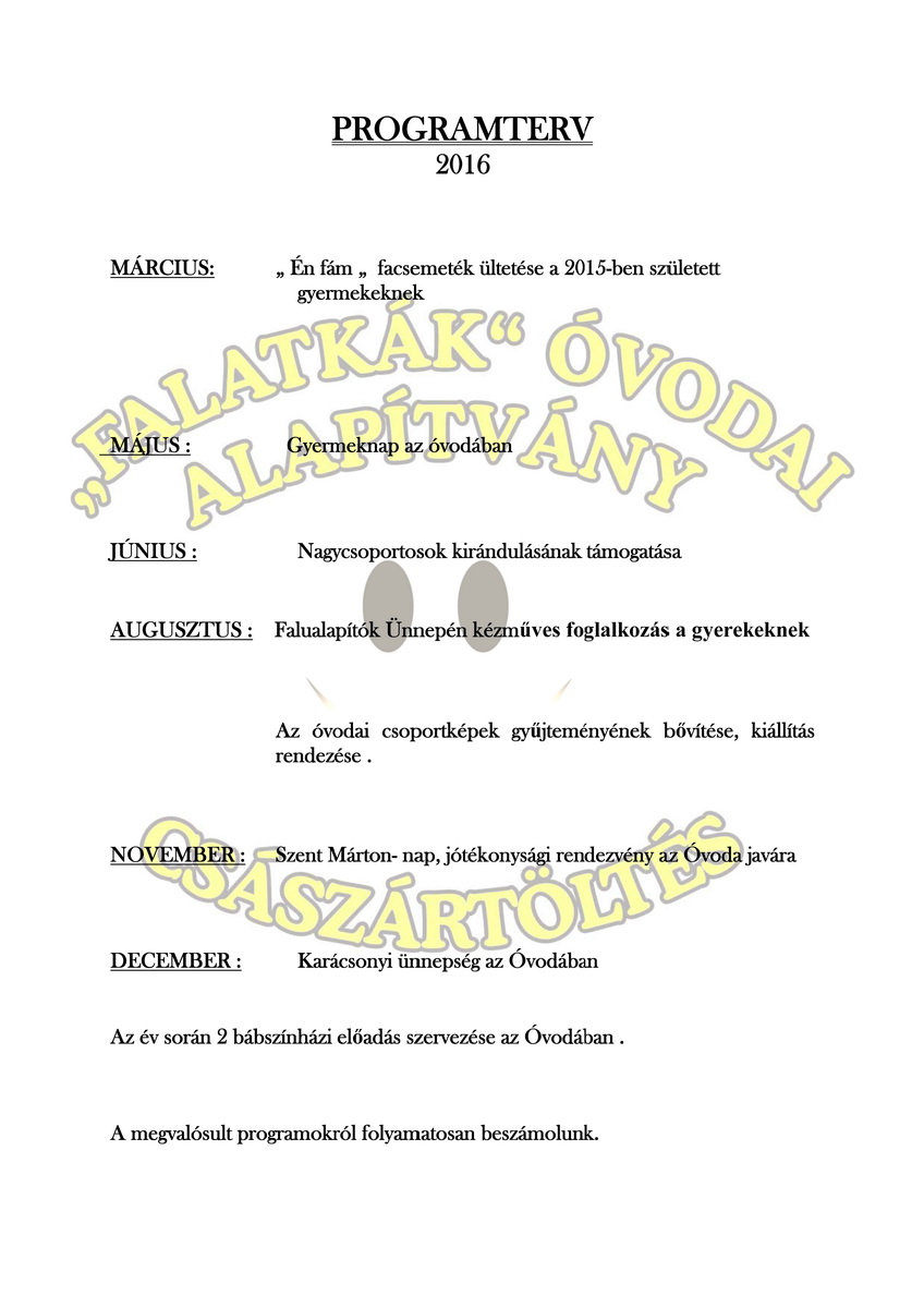 A császártöltési Napközi Otthonos Óvoda gyermekeinek támogatása. Ennek keretén belül: