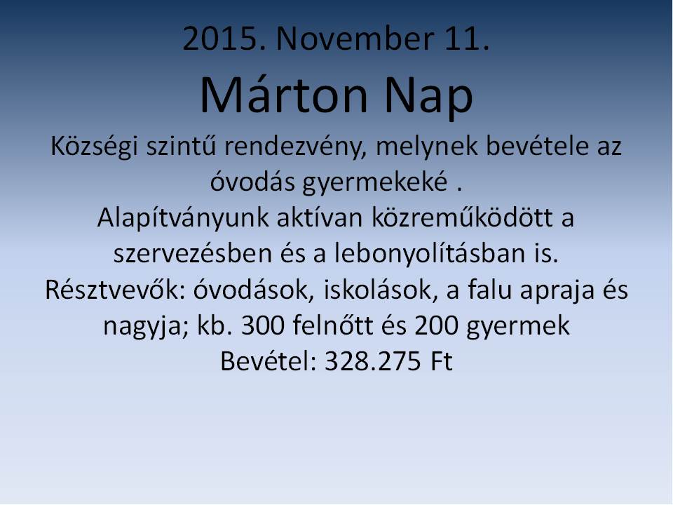 November: Szent Márton napi program, jótékonysági rendezvény az óvoda javára.