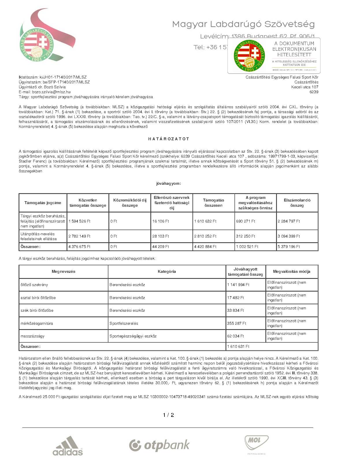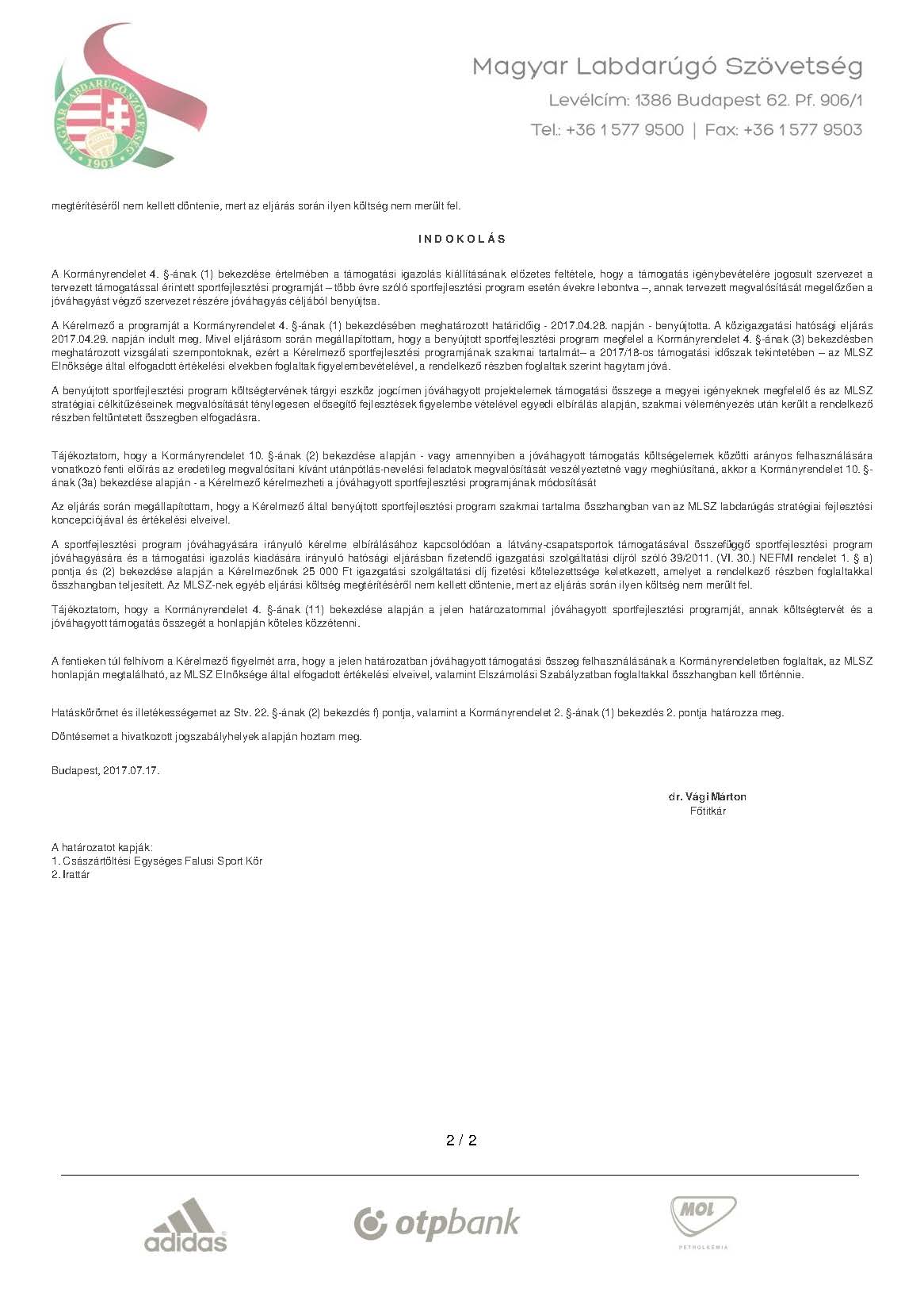 SPORTFEJLESZTÉSI PROGRAM TÁMOGATÓ HATÁROZAT - TAO 2018