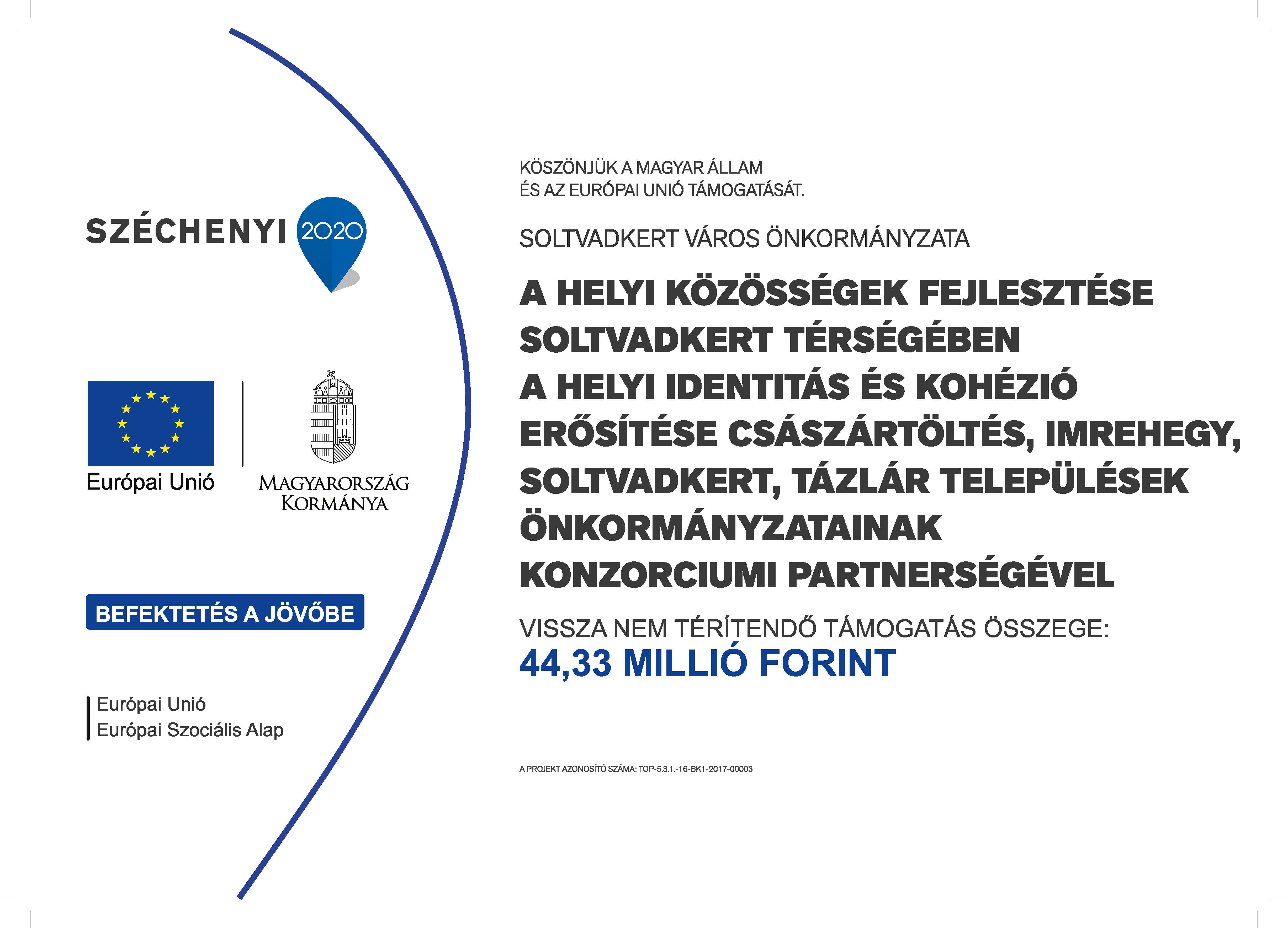 Magyarország Kormányának "A helyi identitás és kohézió erősítése tárgyú TOP-5.3.1-16 kódszámú felhívására Császártöltés, Imrehegy, Soltvadkert, Tázlár települések önkormányzatának előzetes egyeztetését és együttműködési megállapodásának megkötését követően Soltvadkert Város Önkormányzata 2017. szeptember 27-én pályázatot nyújtott be. E pályázatot a Pénzügyminisztérium Regionális Fejlesztési Operatív Programok Irányító hatósága – mint támogató 2018. július 13-i döntése alapján támogatásban részesítette.